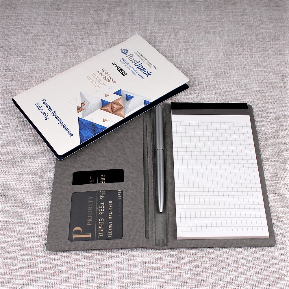 Внешняя часть блокнота выполняет защитную функцию. Также на данной части возможно разместить собственный логотип, фирменное или любое другое изображение.В комплект может входить шариковая ручка.