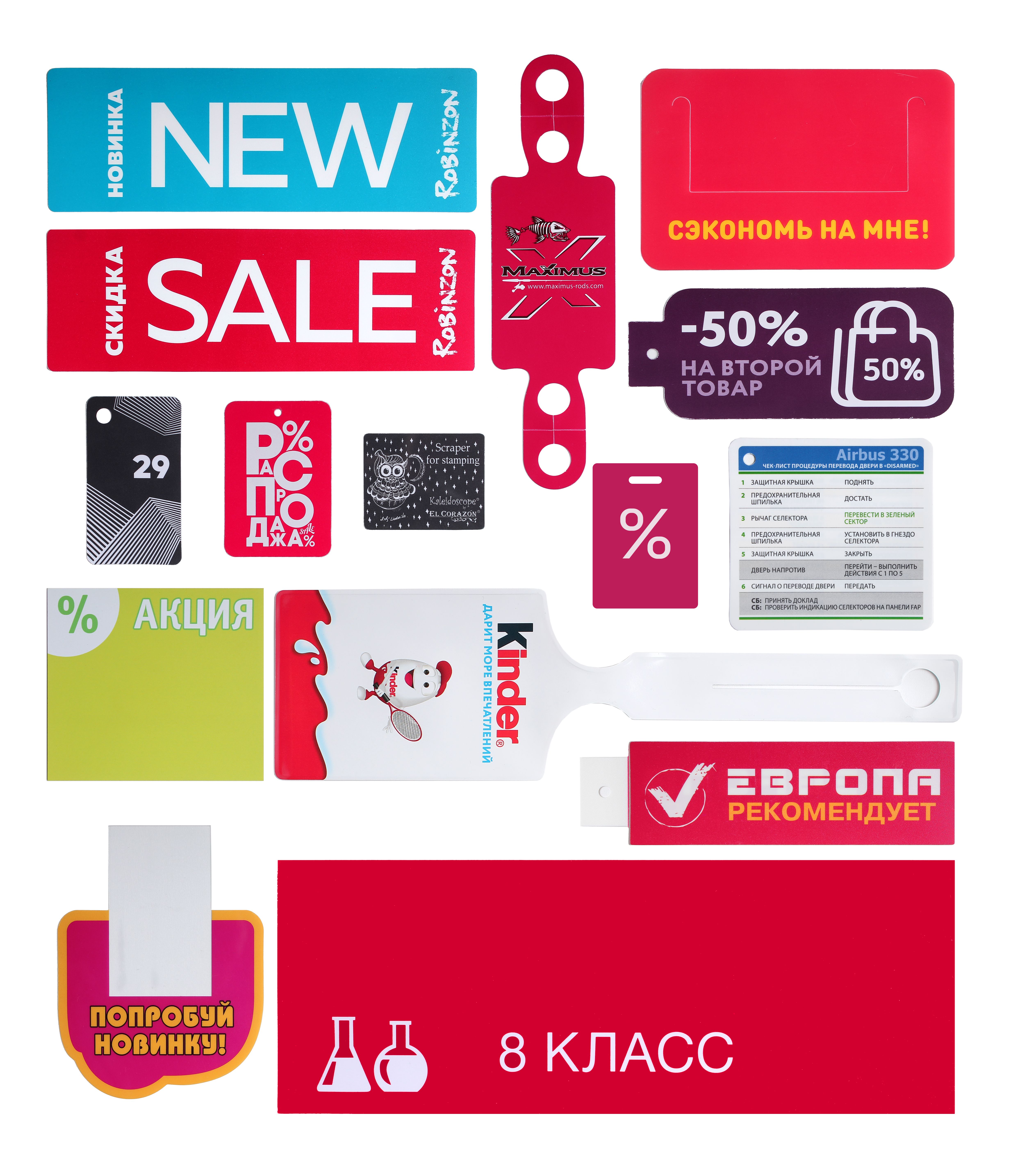 Существует огромное разнообразие POS-материалов. Наиболее популярные мы изготавливаем на нашем производстве. Вся наша продукция изготавливается из пластика. Печать на пластике дороже картонных аналогов, однако более солидный и презентабельный вид позволяет добиться большего экономического эффекта. При этом надо учитывать, что пластиковые POS продукты не меняют форму и работают в магазинах десятилетиями.